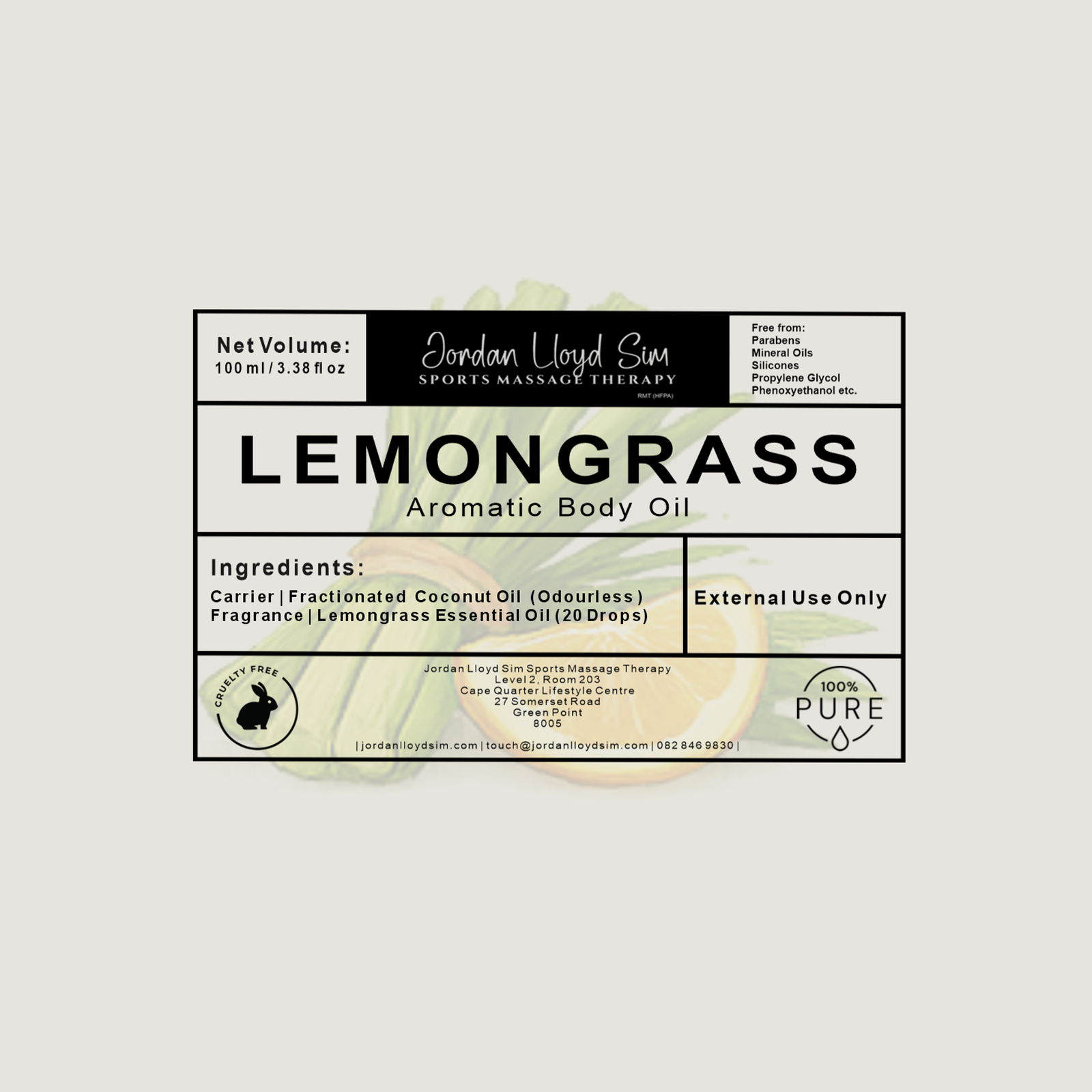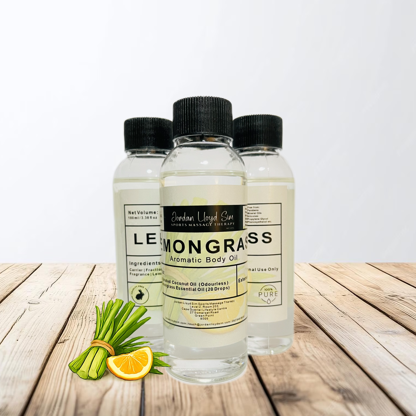 Lemongrass Fresh carries a crisp, citrusy aroma with clean herbal brightness. Each small batch blends premium Lemongrass essential oil into an odourless fractionated coconut oil base — nothing else. The oil absorbs lightly and feels clean on the skin, ideal for daily use or for clients who want a revitalising lift and a calmer, more balanced feel.