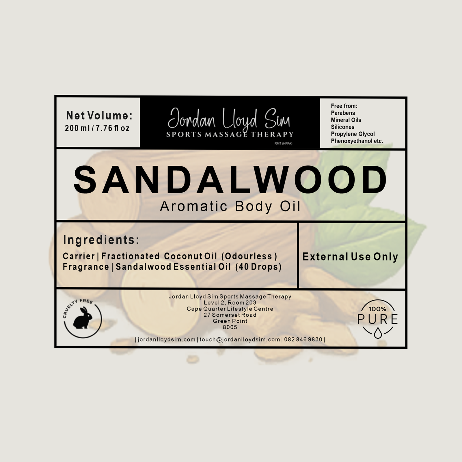 The base is an odourless fractionated coconut oil, combined with Sandalwood Essential Oil. The 100ml bottle contains 20 drops of essential oil, while the 200ml bottle contains 40 drops.
